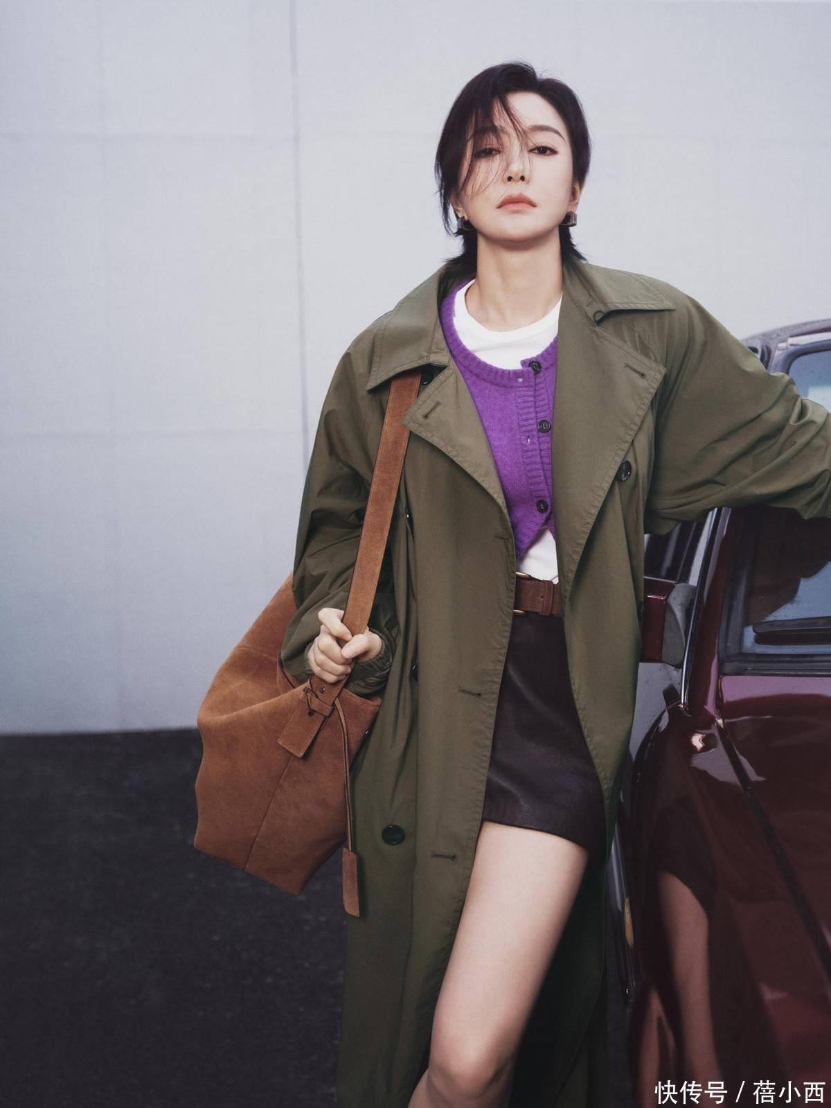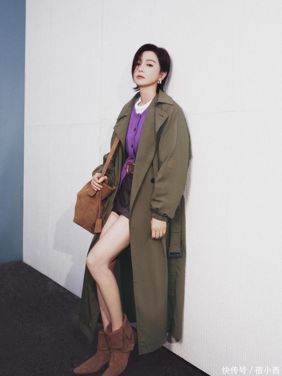 外套为风衣时,并非只能选一件单品做内搭,尽管已经有了紫色小衫,还能再配一款白色内搭。再加上风衣颜色,三种颜色叠在一起层次感简直爆棚。紫色开衫的门襟扣子之所以没有全部扣上,和腿上穿的半身裙有关系。