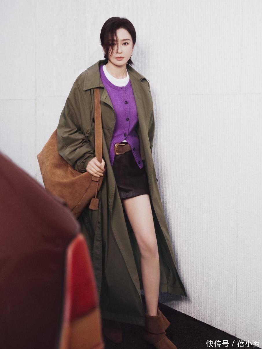 春秋天穿风衣时,只要户外温度不冷,就可以不选择毛衣作为内搭了。秦岚穿了一件紫色小开衫,许多人喜欢此色,与紫气东来的寓意密切相关。这件小开衫没有翻领,圆领款也能在视觉上衬得人干练有气场。紫色开衫的扣子没有选择同色,而是经典黑,黑与紫的结合让人忍不住想多看几眼。